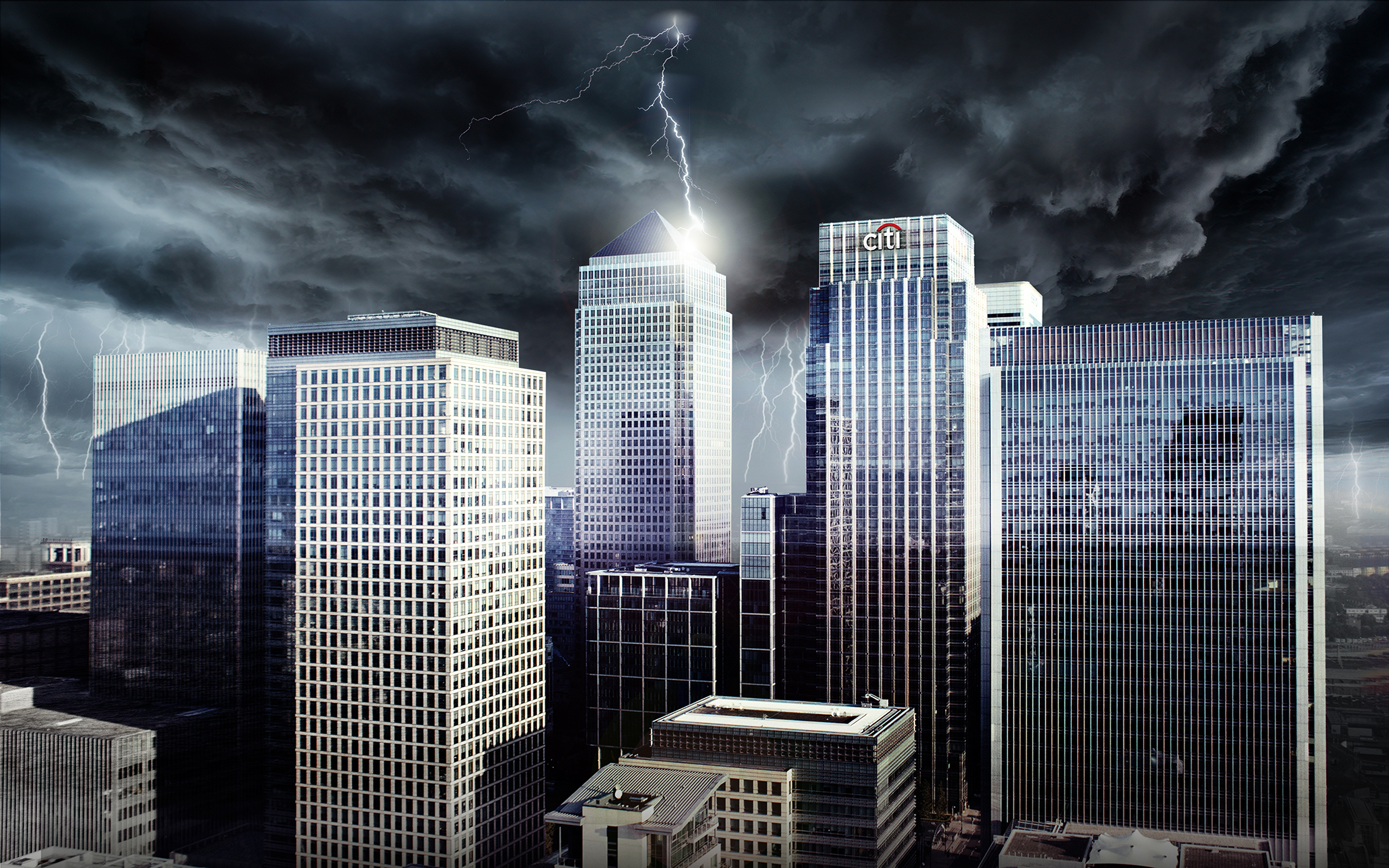 Image collage representing Canary Wharf in a storm. Illustration for article on the trouble this neighbourhood is encountering.